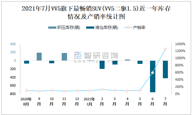 2021年7月VV5旗下最暢銷SUV(VV5二驅(qū)1.5)近一年庫存情況及產(chǎn)銷率統(tǒng)計圖
