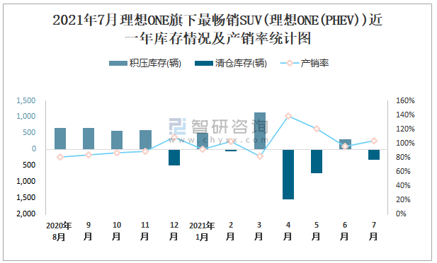 2021年7月理想ONE旗下最暢銷SUV(理想ONE(PHEV))近一年庫存情況及產銷率統計圖