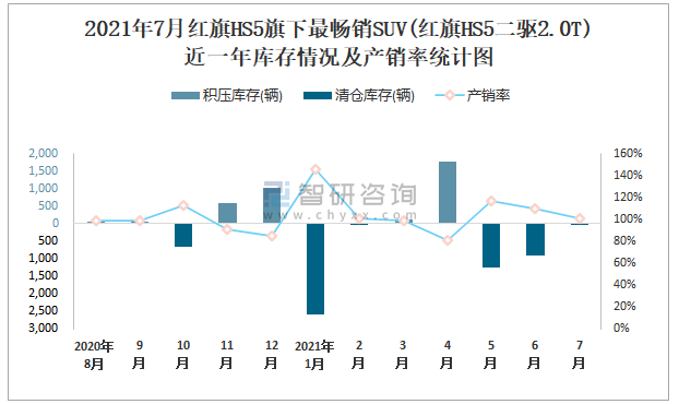 2021年7月紅旗HS5旗下最暢銷SUV(紅旗HS5二驅2.0T)近一年庫存情況及產銷率統計圖
