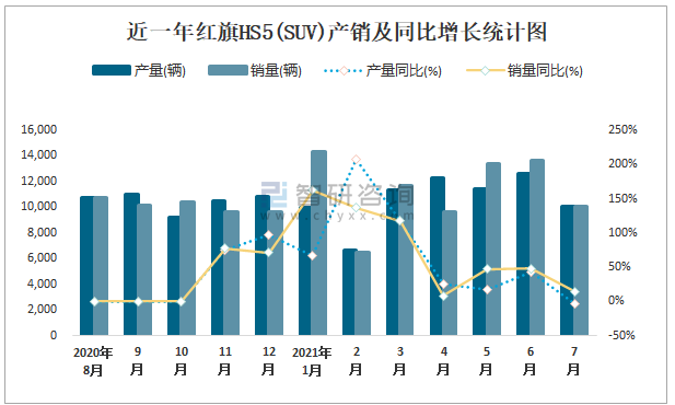 2021年7月紅旗HS5(SUV)產銷量分別為10034輛和10069輛 當月產銷率為100.35%