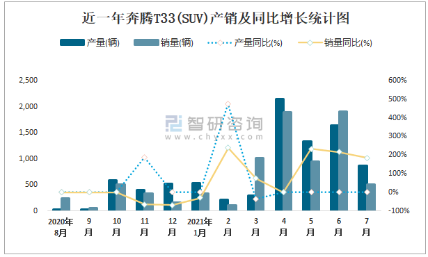根據中國汽車工業協會數據可知:2021年7月奔騰T33(SUV)產量為864輛,同比下降0%,銷量為504輛,同比增長184.8%,當月產銷率為58.33%;2021年1-7月奔騰T33(SUV)累計產量為7026輛,同比下降0%,累計銷量為6718輛,同比增長124%,累計產銷率為95.62%;2019-2020年奔騰T33(SUV)產銷量有所下降,且近2年總產量大于總銷量,積壓了庫存542輛。