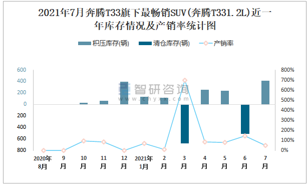 根據中國汽車工業協會數據統計可知:2021年7月奔騰T33(SUV)旗下共有2款SUV在銷售,其中奔騰T331.2L相對暢銷;近一年奔騰T331.2L共積壓庫存449輛,其產銷率存在一定幅度波動,2021年3月產銷率最高(697.37%),清倉庫存681輛,2020年12月產銷率偏低(1.5%),積壓庫存394輛。