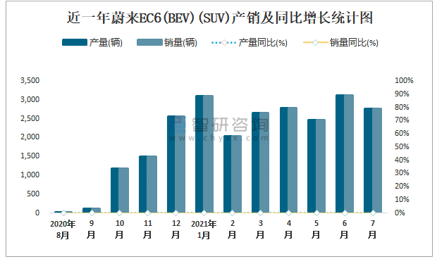 近一年蔚來EC6(BEV)(SUV)產(chǎn)銷及同比增長統(tǒng)計圖