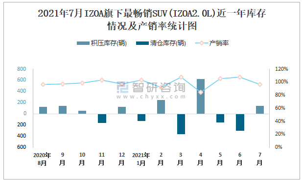2021年7月IZOA旗下最暢銷SUV(IZOA2.0L)近一年庫存情況及產銷率統計圖