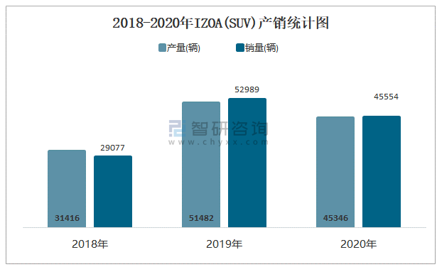 根據中國汽車工業協會數據可知:2021年7月IZOA(SUV)產量為5714輛,同比下降9.6%,銷量為5162輛,同比下降15.8%,當月產銷率為90.34%;2021年1-7月IZOA(SUV)累計產量為30729輛,同比增長46.6%,累計銷量為30234輛,同比增長40.8%,累計產銷率為98.39%;2018-2020年IZOA(SUV)產銷量均在2019年達到最高值,此后有所下降,且近3年總產量大于總銷量,積壓了庫存624輛。