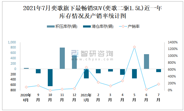 2021年7月奕歌旗下最暢銷SUV(奕歌二驅1.5L)近一年庫存情況及產銷率統計圖