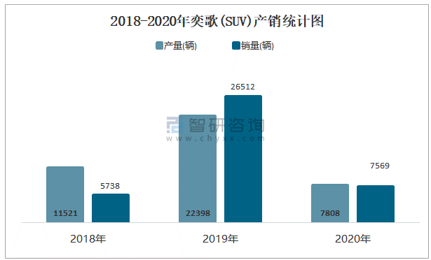 2018-2020年奕歌(SUV)產銷統計圖