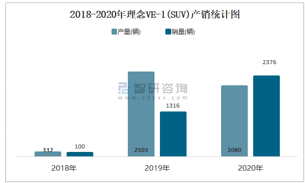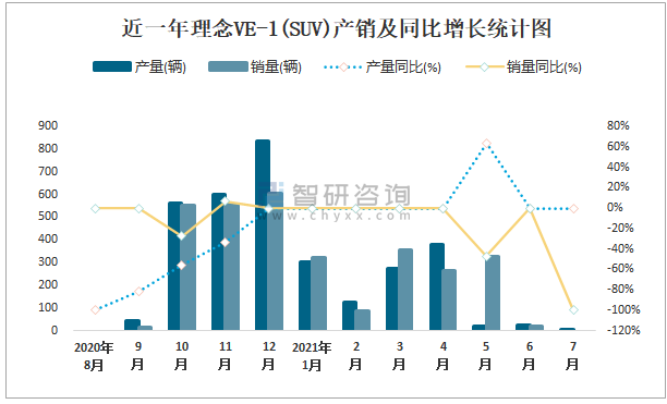 根據中國汽車工業協會數據可知:2021年7月理念VE-1(SUV)產量為2輛,同比下降0%,銷量為0輛,同比下降100%,當月產銷率為0%;2021年1-7月理念VE-1(SUV)累計產量為1131輛,同比下降0%,累計銷量為1375輛,同比增長112.9%,累計產銷率為121.57%;2018-2020年理念VE-1(SUV)銷量逐年遞增,且近3年總產量大于總銷量,積壓了庫存903輛。