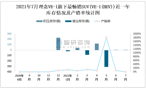 2021年7月理念VE-1旗下最暢銷SUV(VE-1(BEV))近一年庫存情況及產銷率統計圖
