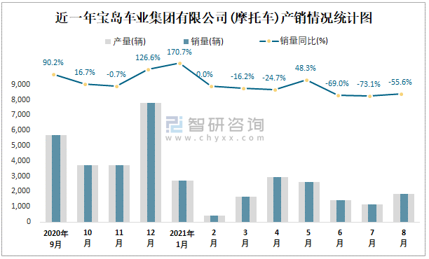 根據(jù)中國汽車工業(yè)(摩托車)產(chǎn)銷快訊數(shù)據(jù)顯示:2021年8月寶島車業(yè)集團有限公司(摩托車)產(chǎn)量為1826輛,同比下降55.55%,銷量為1826輛,同比下降55.55%;2021年1-8月寶島車業(yè)集團有限公司(摩托車)累計產(chǎn)量為14730輛,同比下降36.15%,累計銷量為14730輛,同比下降36.15%;2016-2020年寶島車業(yè)集團有限公司(摩托車)產(chǎn)銷量2017年跌至最低值,此后逐年遞增,且近5年總銷量大于總產(chǎn)量,清倉庫存13輛,暫未出口,全部依靠內(nèi)銷。