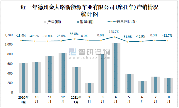 近一年德州金大路新能源車業有限公司產銷情況統計圖