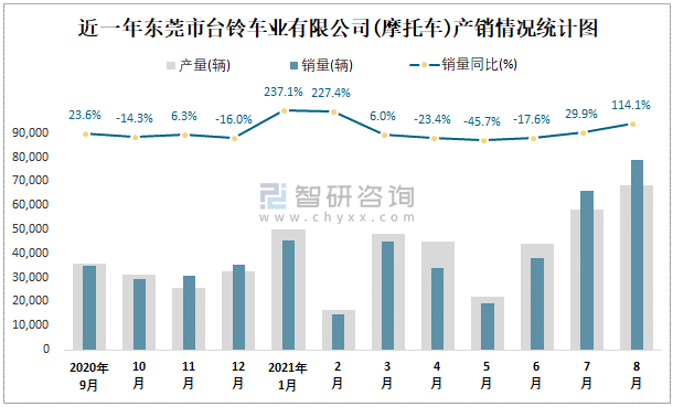 根據(jù)中國(guó)汽車工業(yè)(摩托車)產(chǎn)銷快訊數(shù)據(jù)顯示:2021年8月東莞市臺(tái)鈴車業(yè)有限公司(摩托車)產(chǎn)量為68440輛,同比增長(zhǎng)74.13%,銷量為79084輛,同比增長(zhǎng)114.05%;2021年1-8月東莞市臺(tái)鈴車業(yè)有限公司(摩托車)累計(jì)產(chǎn)量為352598輛,同比增長(zhǎng)21.87%,累計(jì)銷量為341873輛,同比增長(zhǎng)16.13%;2016-2020年?yáng)|莞市臺(tái)鈴車業(yè)有限公司(摩托車)產(chǎn)銷量逐年遞增,且近5年總產(chǎn)量大于總銷量,積壓了庫(kù)存2846輛,暫未出口,全部依靠?jī)?nèi)銷。