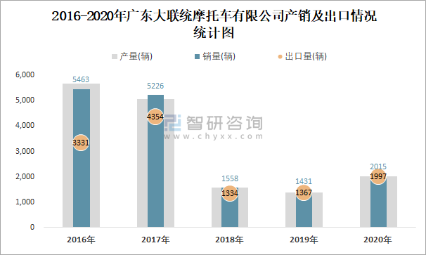 2016-2020年廣東大聯統摩托車有限公司產銷及出口情況統計圖