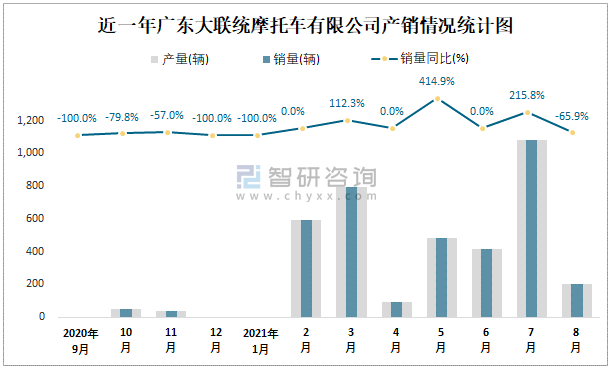 近一年廣東大聯統摩托車有限公司產銷情況統計圖