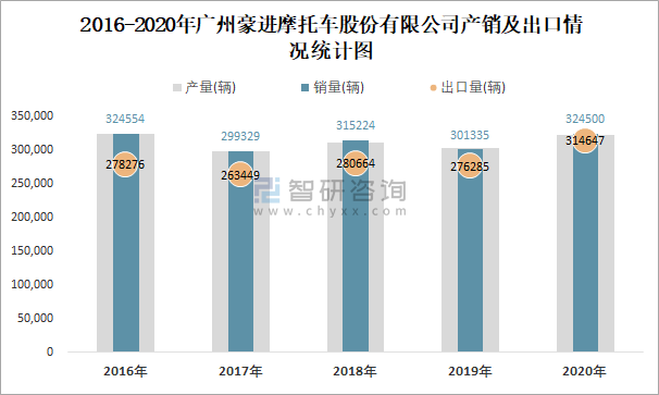 2016-2020年廣州豪進摩托車股份有限公司產銷及出口情況統計圖