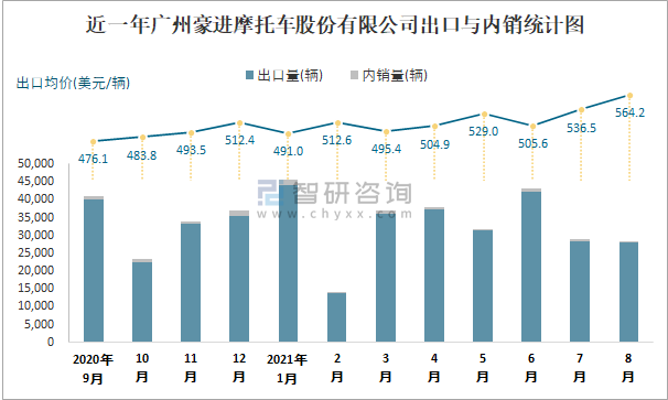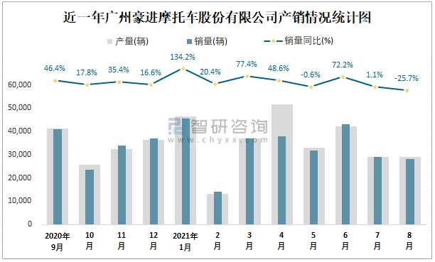 根據中國汽車工業(摩托車)產銷快訊數據顯示:2021年8月廣州豪進摩托車股份有限公司(摩托車)產量為28962輛,同比下降24.07%,銷量為28269輛,同比下降25.72%;2021年1-8月廣州豪進摩托車股份有限公司(摩托車)累計產量為281449輛,同比增長49.73%,累計銷量為266979輛,同比增長41.24%;2016-2020年廣州豪進摩托車股份有限公司(摩托車)產銷量相對平穩,漲跌幅度較小,且近5年總銷量大于總產量,清倉庫存3333輛,總體銷量以出口為主。