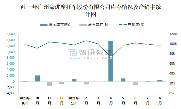 近一年廣州豪進摩托車股份有限公司庫存情況及產銷率統計圖