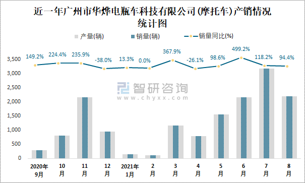 近一年廣州市華燁電瓶車科技有限公司產(chǎn)銷情況統(tǒng)計圖