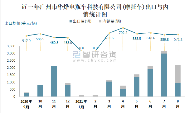 根據(jù)中國汽車工業(yè)(摩托車)產(chǎn)銷快訊數(shù)據(jù)統(tǒng)計可知:近一年廣州市華燁電瓶車科技有限公司(摩托車)產(chǎn)多少銷多少,無積壓庫存;近一年廣州市華燁電瓶車科技有限公司(摩托車)銷量以出口為主,總出口量占比總銷量的83.1%,出口均價4月達到最高值,此后總體呈現(xiàn)下降趨勢,其中8月出口量為963輛,出口均價約為571.13美元/輛;2021年1-8月廣州市華燁電瓶車科技有限公司(摩托車)累計出口量為8856輛,同比增長58.77%,累計出口金額約為530.2萬美元,同比增長90.79%。