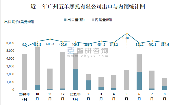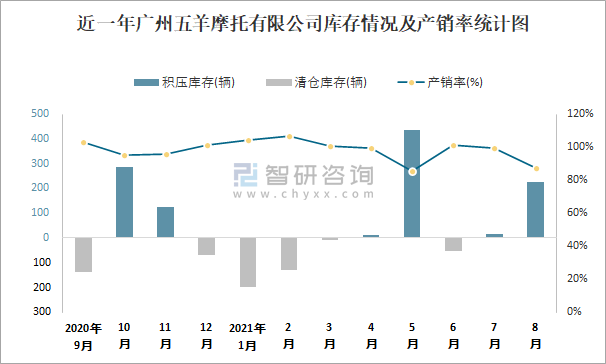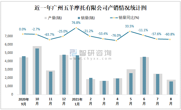 根據中國汽車工業(摩托車)產銷快訊數據顯示:2021年8月廣州五羊摩托有限公司(摩托車)產量為1787輛,同比下降54.13%,銷量為1560輛,同比下降60.79%;2021年1-8月廣州五羊摩托有限公司(摩托車)累計產量為21753輛,同比下降36.36%,累計銷量為21457輛,同比下降37.93%;2019-2020年廣州五羊摩托有限公司(摩托車)產銷量逐步上升,且近2年總銷量大于總產量,清倉庫存281輛,出口量偏少,銷量以內銷為主。