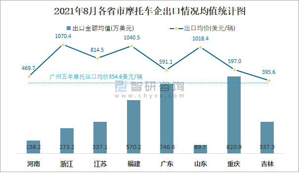 2021年8月各省市摩托車企出口情況均值統計圖