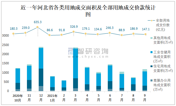 近一年河北省各類用地成交面積及全部用地成交價款統計圖