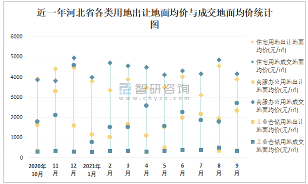 近一年河北省各類用地出讓地面均價與成交地面均價統計圖