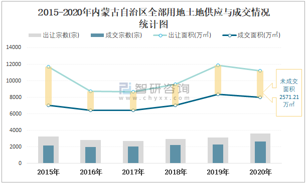 2015-2020年內蒙古自治區全部用地土地供應與成交情況統計圖