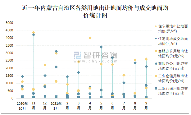 近一年內蒙古自治區各類用地成交面積及全部用地成交價款統計圖