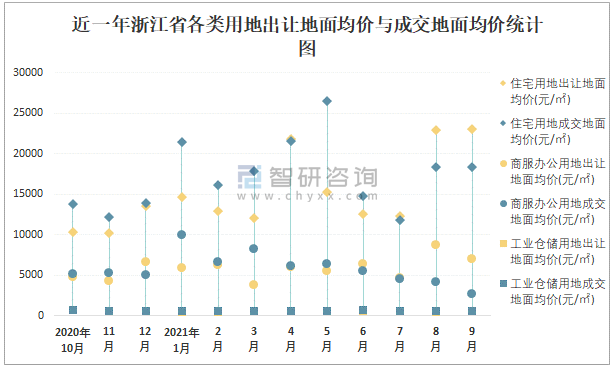 近一年浙江省各類(lèi)用地出讓地面均價(jià)與成交地面均價(jià)統(tǒng)計(jì)圖