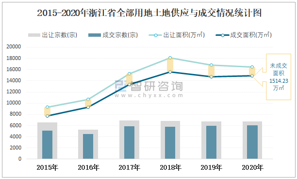 2015-2020年浙江省全部用地土地供應(yīng)與成交情況統(tǒng)計(jì)圖