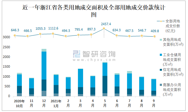近一年浙江省各類(lèi)用地成交面積及全部用地成交價(jià)款統(tǒng)計(jì)圖