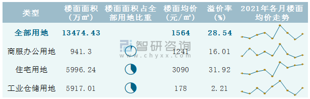 根據國信房地產信息網數據統計可知:2021年9月安徽省全部用地出讓地面均價為3342元/㎡,其中住宅用地出讓地面均價最高(7185元/㎡),全部用地成交地面均價為2051元/㎡,其中住宅用地成交地面均價為6888元/㎡,高于商服辦公用地成交地面均價;2021年1-9月安徽省住宅用地樓面面積占其全部用地比重最多,為44.5%,溢價率為31.92%。