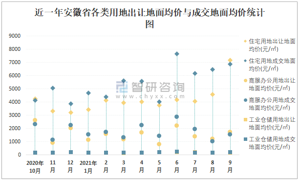 近一年安徽省各類用地出讓地面均價與成交地面均價統計圖