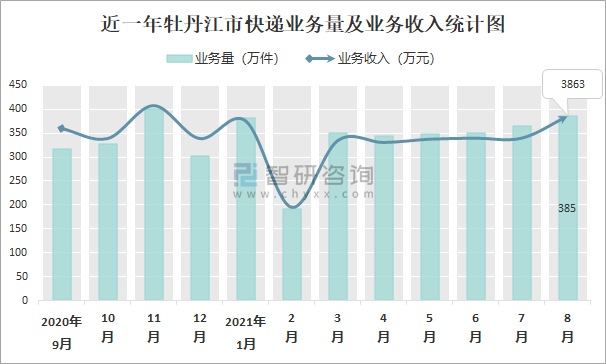 2021年8月牡丹江市快遞業務量與業務收入分別為385萬件和3863萬元