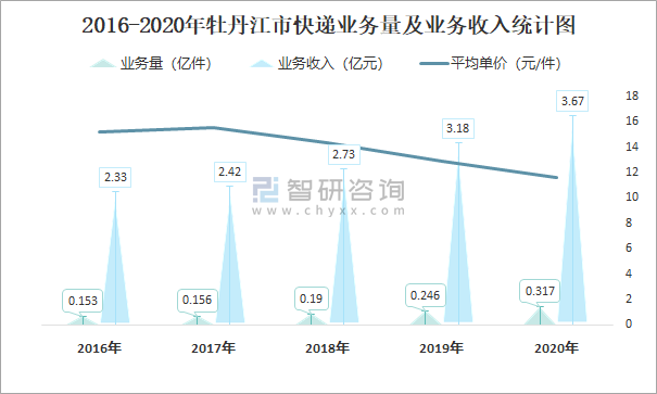 2016-2020年牡丹江市快遞業務量及業務收入統計圖