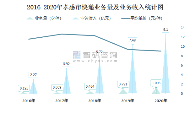 2016-2020年孝感市遞業務量及業務收入統計圖