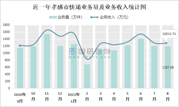 根據各省市郵政局數據可知:2021年8月孝感市快遞業務量占湖北快遞業務量的5.33%,湖北快遞業務量占全國快遞業務量的2.55%;2021年8月孝感市快遞業務收入占湖北快遞業務收入的5.1%,湖北快遞業務收入占全國快遞業務收入的2.39%。