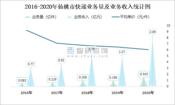 2016-2020年仙桃市快遞業務量及業務收入統計圖