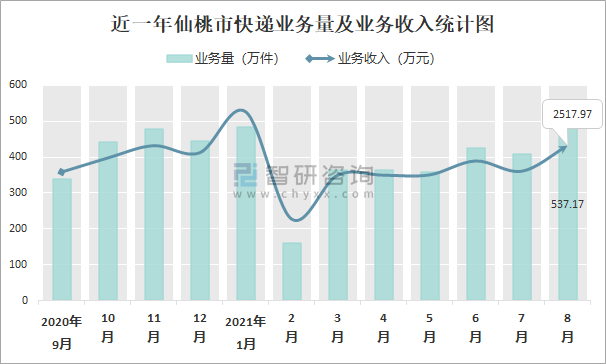2021年8月仙桃市快遞業務量與業務收入分別為537.17萬件和2517.97萬元