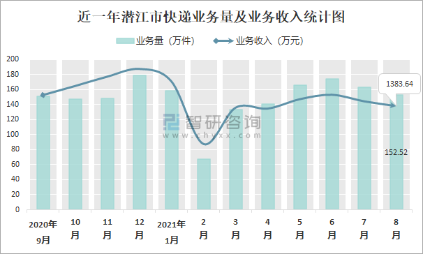根據各省市郵政局數據可知:2021年8月潛江市快遞業務量為152.52萬件,業務收入為1383.64萬元;2021年1-8月潛江市快遞累計業務量為1155.7萬件,同比增長115.87%,累計業務收入為11140.93萬元,同比增長57.42%;2016-2020年潛江市快遞業務量與業務收入均逐年遞增,平均單價存在一定幅度的波動。