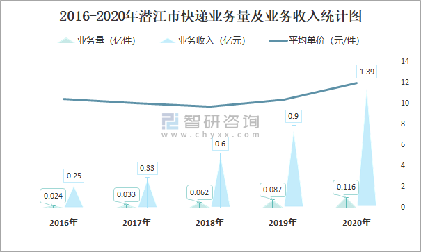 2016-2020年潛江市快遞業務量及業務收入統計圖