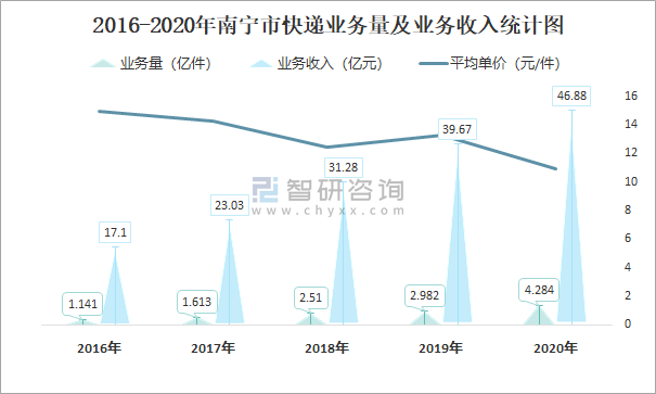 2016-2020年南寧市快遞業務量及業務收入統計圖
