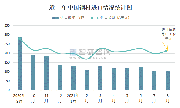 近一年中國鋼材進口情況統計圖