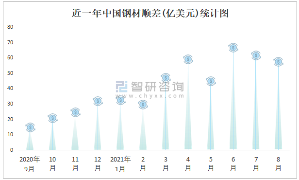近一年中國鋼材順差(億美元)統計圖