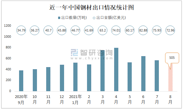 近一年中國鋼材出口情況統計圖
