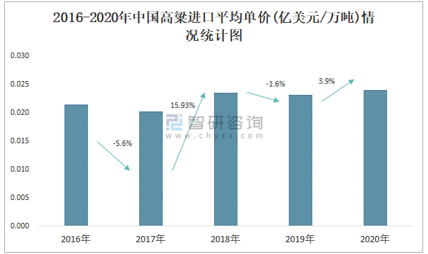根據中國海關數據顯示:2016-2020年中國高粱進口數量與進口金額均在2019年跌至最低值,此后大幅度上升;2016-2020年中國高粱進口平均單價2018年增長速度最快,而在2017年下滑速度最快,下滑了5.6%。