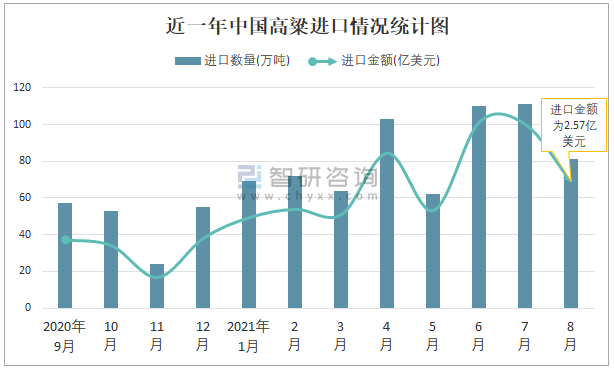 2021年8月中國高粱進口數量和進口金額分別為81萬噸和2.57億美元