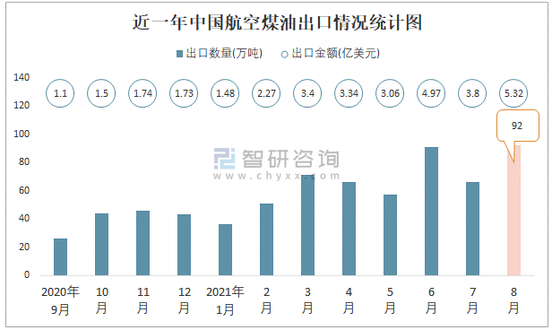 根據中國海關數據顯示:2021年8月中國航空煤油進口數量為12萬噸,同比增長9%,進口金額為0.75億美元,同比增長79.8%,2021年8月中國航空煤油出口數量為92萬噸,同比增長210.8%,出口金額為5.32億美元,同比增長384.7%;2021年1-8月中國航空煤油進口數量為99萬噸,進口金額為5.39億美元,出口數量為531萬噸,出口金額為28.19億美元。