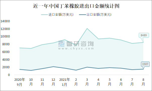 近一年中國丁苯橡膠進出口金額統計圖